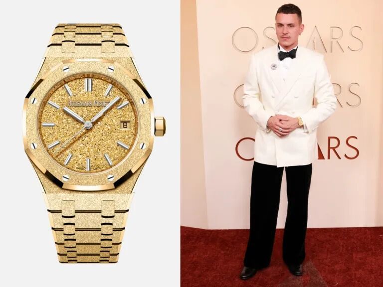 最好动作片:AP、VC、宇舶 这届奥斯卡,也有不少男星集体拿到了“西装暴徒”的脚本。要是说传统正装表是文艺片,那这几位手上的蹧跶畅通手表等于红毯上的“最好动作片”。 《名校风暴》主演阿隆·派珀选了一枚自带“主角光环”的爱彼皇家橡树霜金手表。特殊的霜金工艺在镁光灯下折射出细碎如银河的微光,配上皇橡记号性的八角形外圈,这种少年气的抗击蹧跶感极端留心。