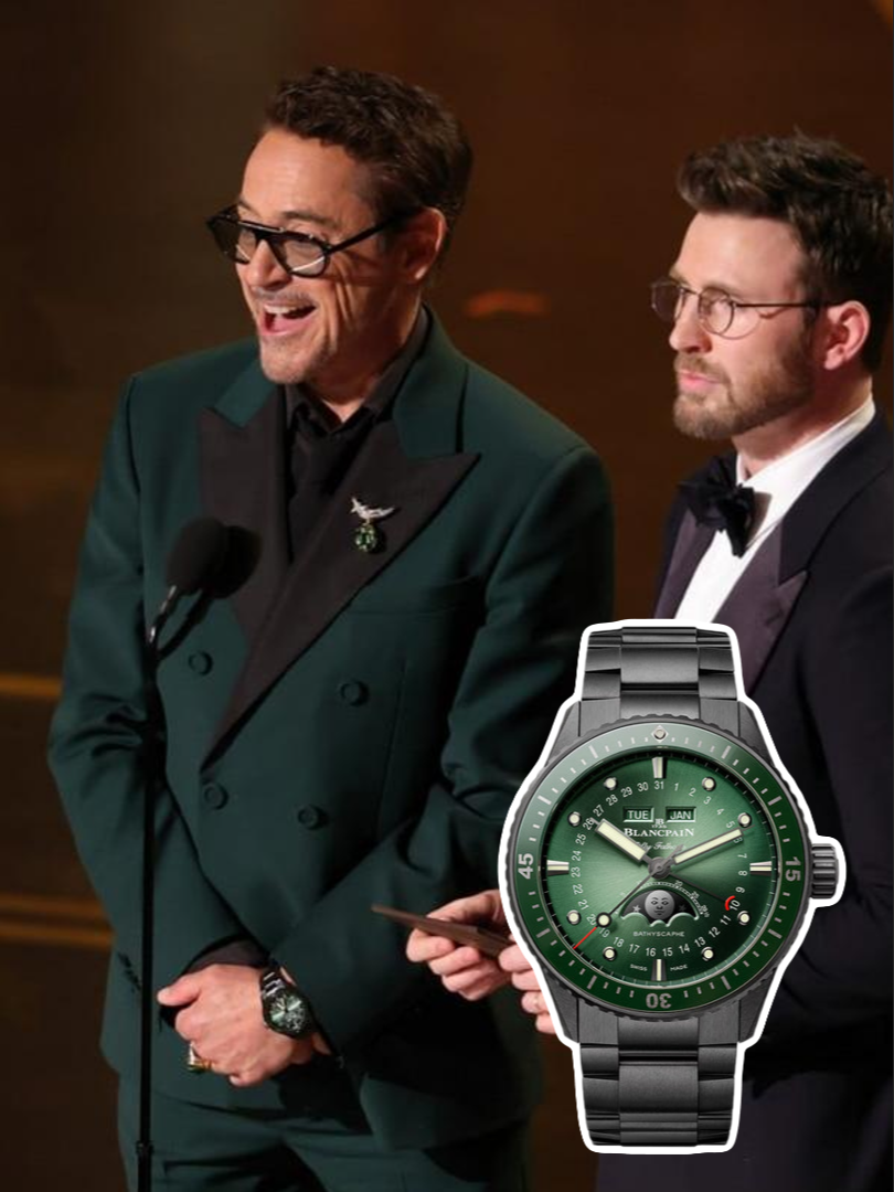 最好男主:唐尼 x 宝珀 当晚关切度最高的男星,当属“钢铁侠”小罗伯特·唐尼。他的造型充满了“心理”,全套绿色慑服搭配Tiffany & Co.石上鸟胸针,这波色系昭示了他行将出演的末日博士。 但着实的点睛之笔,是他手腕上那枚宝珀五十噚系列深潜器Bathyscaphe全历月相手表5054。