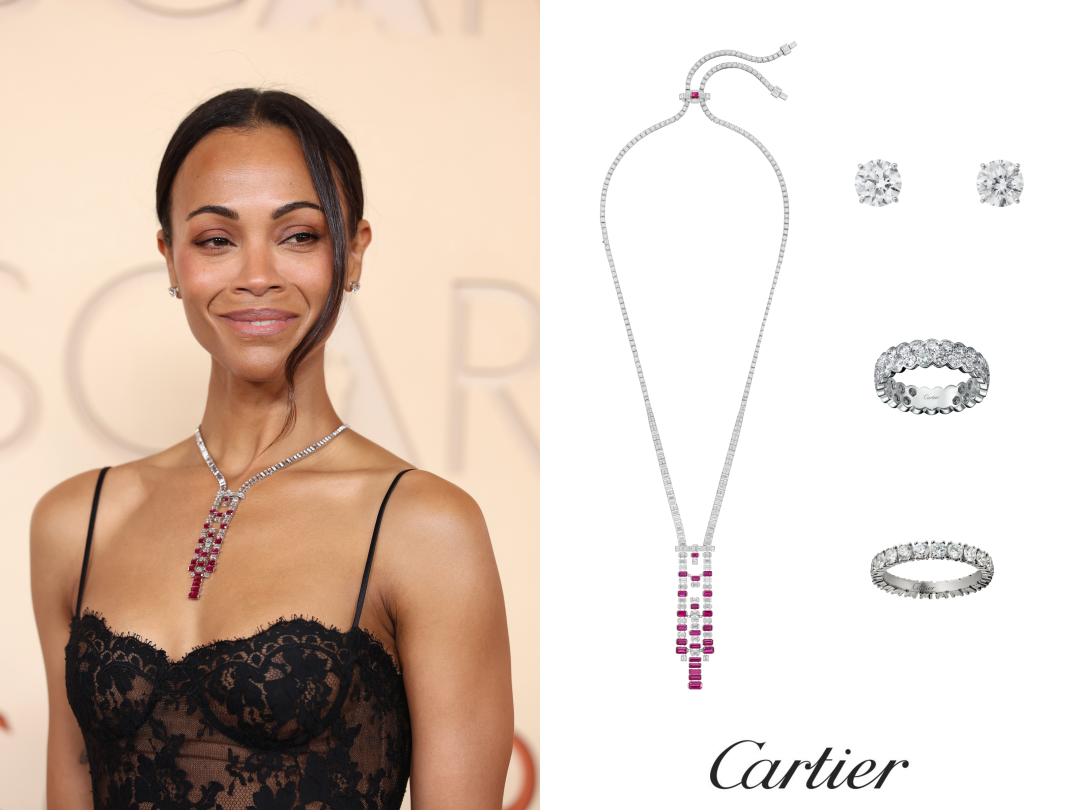 客岁奥斯卡最最好女配佐伊·索尔达娜,本年辅导了卡地亚铂金红坚持钻石高等珠宝项链。极具Art Deco凌厉几何线条的作风,私密与1920年代呼应。佐伊特地遴荐一条低调的Saint Laurent玄色慑服,有一种不动声色大女主的气场。