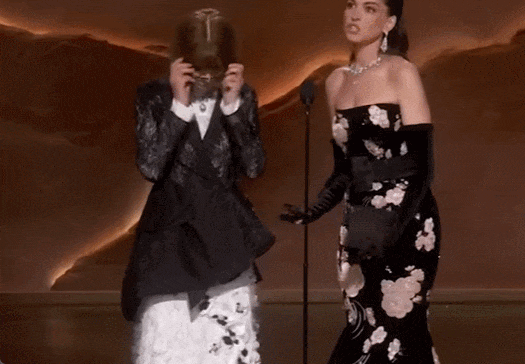 话说本年奥斯卡,也宛如一个大型真东谈主秀现场,嘉宾们个个都太能整活儿。 比如安娜·温图尔现场演绎本尊版《穿普拉达的女王》,面临剧中的助理安妮海瑟薇的问题:“你认为我今晚的裙子选得怎样样?”,径直戴上墨镜无视,还冷冷抛出一句“看提名名单吧”。