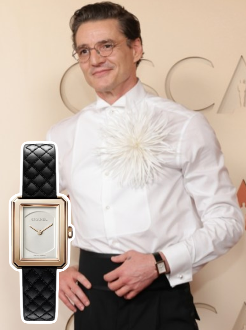 最好反串:男星戴女表 本年的最好反串奖要颁给“女表男戴”,把刚柔并济玩到了极致。 “曼达洛东谈主大叔”佩德罗·帕斯卡不光全套Chanel定制,腕间还搭配了Chanel Boy·Friend手表,极简的八角形笼统戴在粗莽的大叔手腕上,增添了几分文质彬彬的气质。