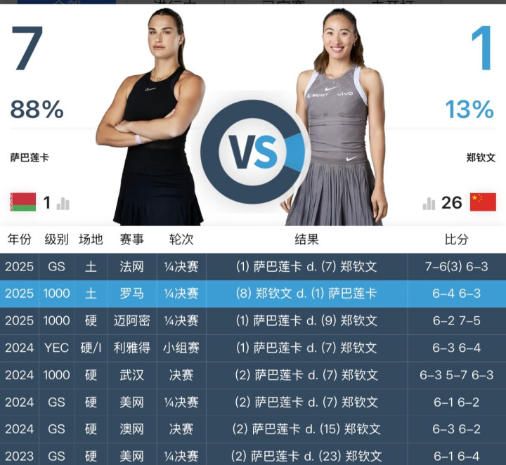 郑钦文下一轮又遭逢了老敌手萨巴伦卡。如今的萨巴伦卡情状正佳,寰球名规律一。郑钦文此前和萨巴伦卡交手8次,战绩为1胜7负。萨巴伦卡在晋级第四轮之后,谈到将和郑钦文交锋时说说念:“对阵郑钦文的比赛,照旧先要作念好我方,从开场的第一球就要专注。郑钦文是很纷乱的敌手,我很期待和她的比赛。” 郑钦文惟一打败萨巴伦卡的比赛是在2025年的罗马站1/4决赛豪门国际官网娱乐网,她以6-4/6-3收效。此次,郑钦文能否翻越寰球第一这座大山? 幸运飞艇APP官网下载 |