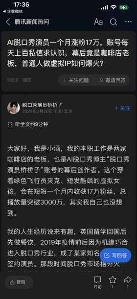 AI脱口秀演员桥桥子。图/嘱托平台截图 3月26日,该账号握有者小酒在腾讯新闻的“逐日热问”栏目发布对于“平淡东谈主作念臆造IP如何爆火”的文章也成绩了不少浏览量,登上了热问榜第四。