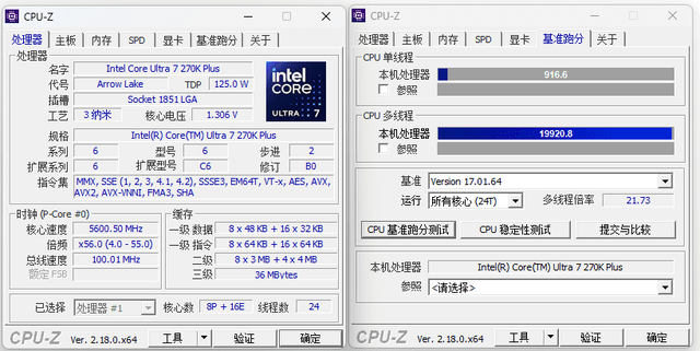 在默许BIOS景色下: Intel Core Ultra 7 270K Plus单核得分为888.9,多核收货为18206.4