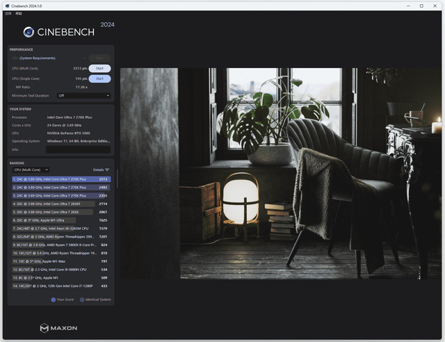CINEBENCH 2024测试:单核性能得分增多到145,多核性能得分增多到2513