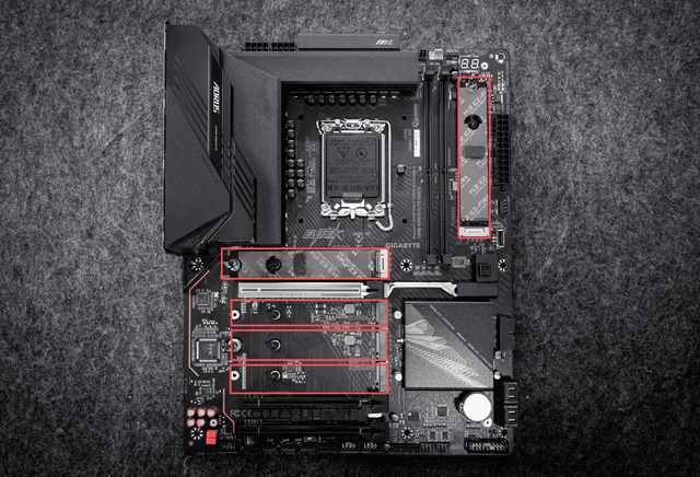 同期,主板的M.2硬盘插槽也全隐敝了散热装甲,且相沿快拆联想,幸免硬盘因高温导致读写情况着落。该主板一共搭载了5个M.2插槽,其中1个相沿PCIe 5.0 x4通谈(位于CPU插槽整下方),4个相沿PCIe 4.0 x4通谈,均相沿22110/2280/2260/2242规格,