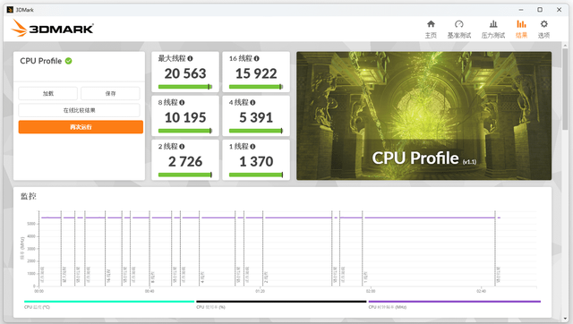 3DMARK CPU Profile测试,单线程得分1370,2线程得分2726,4线程得分5391,8线程得分10195,16线程得分15922,最大线程得分20563。