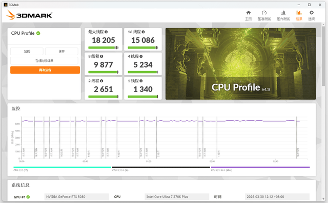3DMARK CPU Profile测试,单线程得分1340,2线程得分2651,4线程得分5234,8线程得分9877,16线程得分15086,最大线程得分18205。