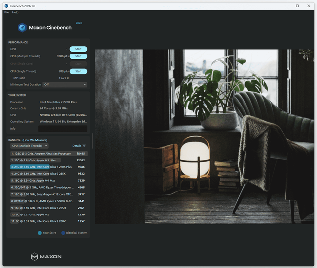 CINEBENCH 2026测试:单核性能得分为589,多核性能得分为9286