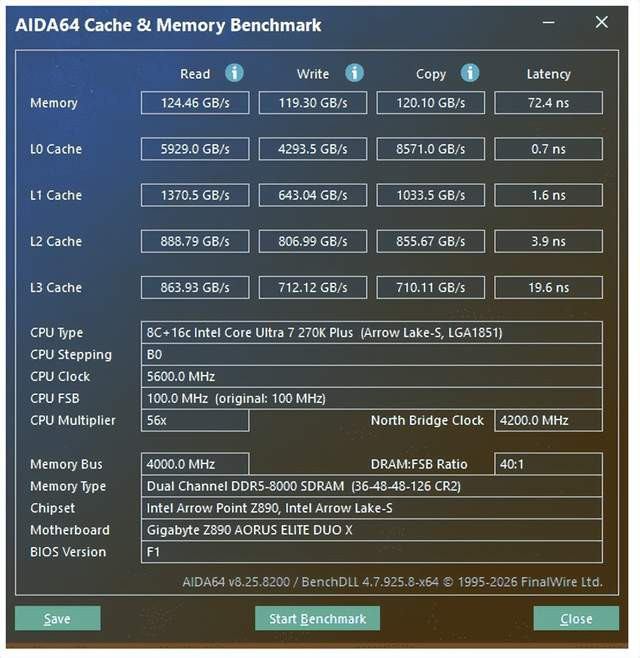 通过AIDA64实测,读取速率为124.46GB/s,写入速率为119.30GB/s,复制速率为120.1GB/s,蔓延也降到72.4ns。