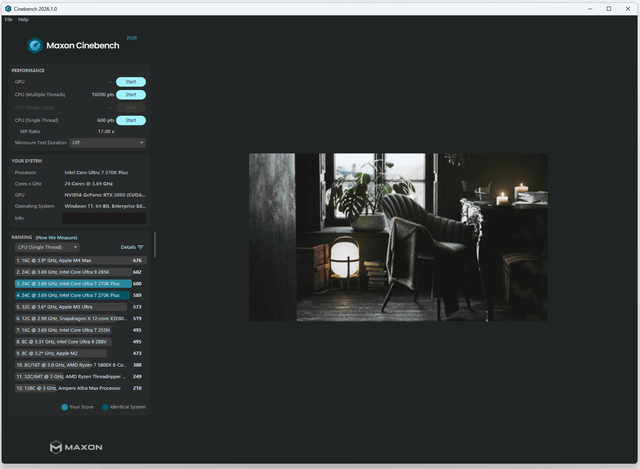 CINEBENCH 2026测试:单核性能得分增多到600,多核性能得得分增多到10200