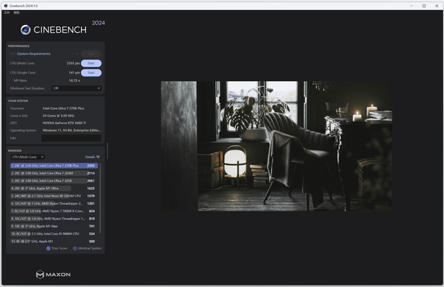 CINEBENCH 2024测试:单核性能得分141,多核性能得分2355