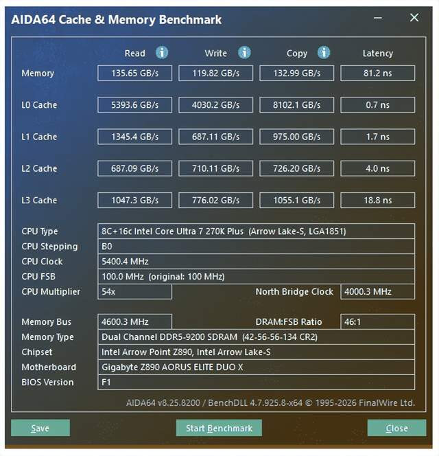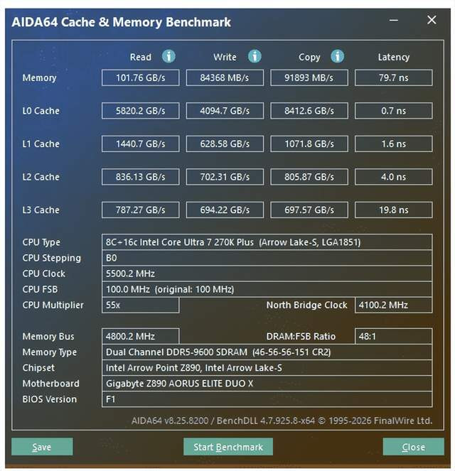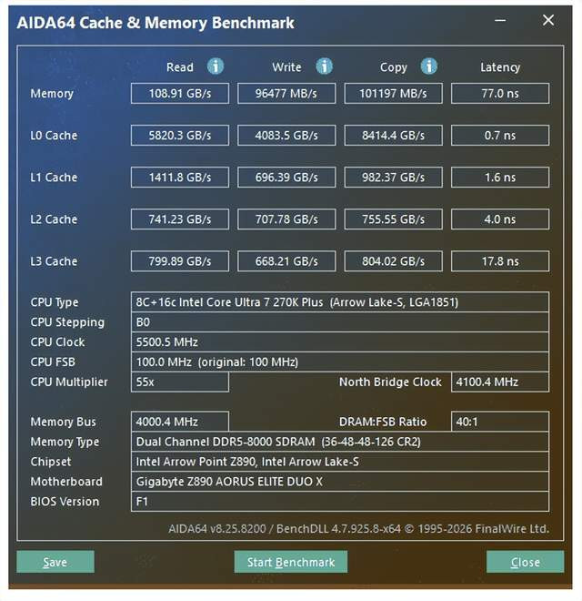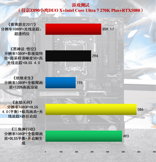 性能实测:性能无瓶颈 测试平台: 处分器:Intel Core Ultra 7 270K Plus 主板:技嘉Z890 AORUS ELITE DUO X 内存:金百达白刃DDR5 16GB*2 8000MT/s 硬盘:WD850X 1TB 显卡:RTX5080 电源:长城F10猎金部落 1000W 白金电源