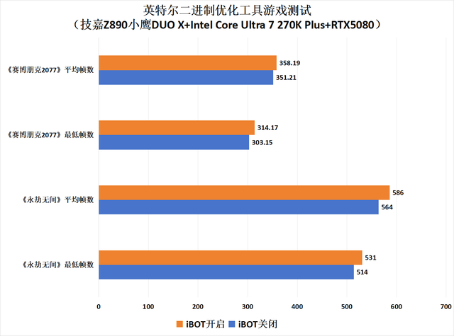 游戏测试:iBOT开启升迁赫然 值得一提的是,Intel在酷睿Ultra 200S Plus系列处分器上新增了Intel二进制优化器用(iBOT)。这项技艺依靠英特尔多年的优化警戒,能智能识别千般独揽,优化提醒践诺,升迁CPU运转结束。开启后能它会动态调养提醒践诺、减少无效运算、优化缓存调用,让游戏帧率更稳,渲染、编译等坐褥力任务更快。据官方数据泄漏,开启后游戏性能平均能升迁15%,。至于装配也很浅易,通过Intel iPPP平台性能包一键装配,就能同期开启APO和iBOT。