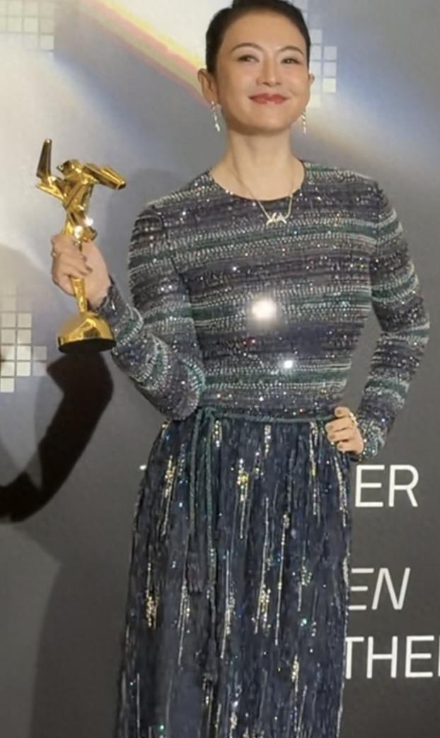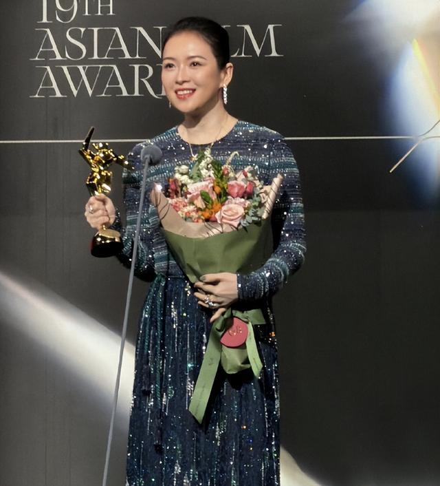 她登上台去领取非常亚洲电影东谈主大奖。 处于聚光灯之下,她的身形有那么少许丰腴,但是少许儿也不垂死。