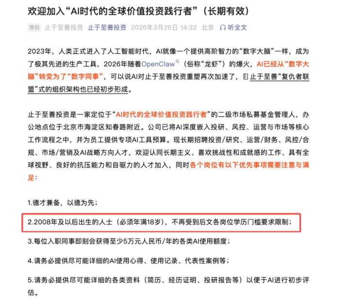 [导读]私募招聘冲破学积年纪壁垒,AI时期资管业东说念主才取舍迎变革 中国基金报记者孙越 近日,私募机构止于至善投资发了一则招聘公告:年满18岁、高中学历就能投,不卡学历、不卡训戒,独一硬性条目——懂AI。