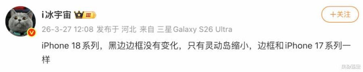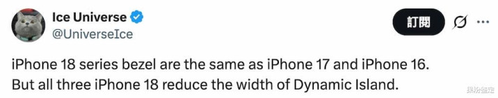 随后也在 X(前 Twitter)平台上 补充说明 ,至少会有三款 iPhone 18 系列机型继承更窄的灵动岛新联想,那似乎也代表除了 iPhone 18 Pro 和 iPhone 18 Pro Max 高端款机型会继承全新 Face ID 联想外,就连同基本款 iPhone 18 也会继承调换缩窄灵动岛造型。