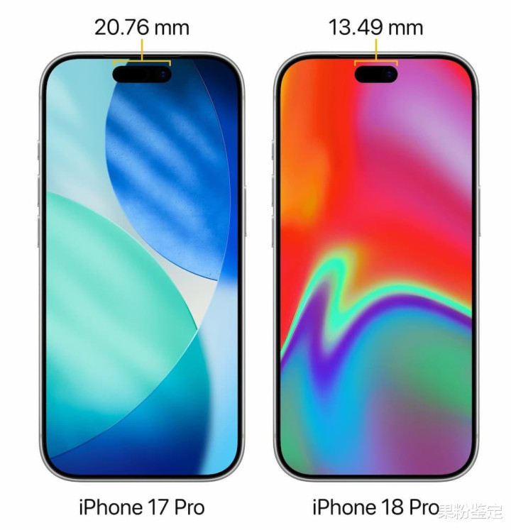 据了解 iPhone 18 Pro 系列灵动岛尺寸将会减轻约35%,屏幕占比将提高至94%~95%,从下面与 iPhone 17 Pro 对比图简略发现,在动态岛区块快要少了约7.27mm,以面积规划减少约35%,让顶部可视面积也更大。