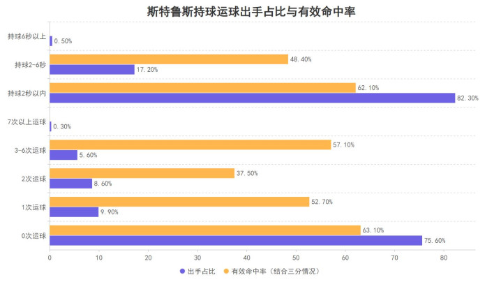 同期,斯特鲁斯接球不再运球的起初占比高达75.6%,7次运球以上与执球6秒以上的起初险些莫得,这意味着他是别称极为依赖接球就投的球员,而这么作念也能令他的通顺战也等于聚合三分情况的灵验掷中率达到最高的水准,这些均不错标明他十分依赖队友才略灵验的得分,而这些与新骑士哈登+米切尔两大双能卫执球发起进军的方法极为匹配,由于哈登与米切尔皆是能攻能传的超等后卫,骑士并不需要具备执球进军的才略反而最需要能消化起初的功能性球员,而斯特鲁斯还有一个特色是最为特别的: