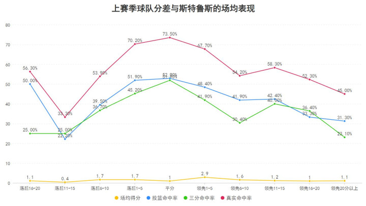 上赛季当骑士与敌手分差在过期5分到跨越5分之间时,斯特鲁斯的投篮掷中率、三分掷中率与聚合三分罚球情况的真正掷中率均达到了最高的水准,而随下过期与跨越的越多那么他的各项掷中率会出现较多的下滑,这意味着当骑士濒临分差较劲的心焦时分时斯特鲁斯的得分更灵验果也愈加值得信托,因此他的赛季掷中率看似不算最顶尖,但却是能助球队蹂躏僵局渡过难关的阿谁东说念主。