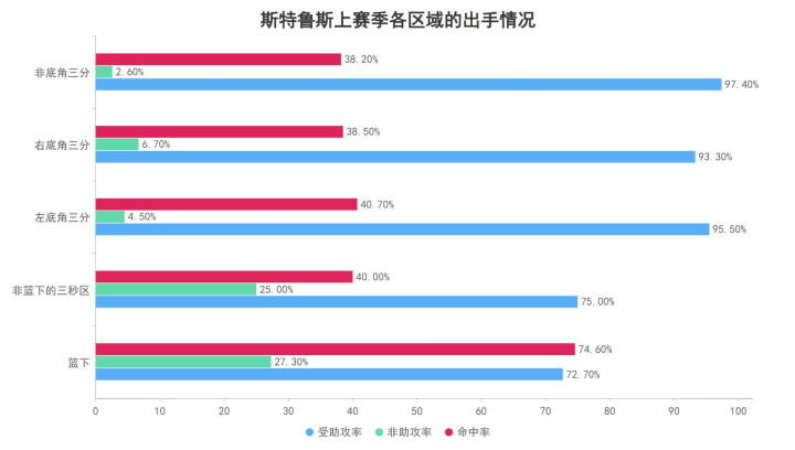 上赛季的斯特鲁斯除了中投险些莫得外,在各个区域的得分受助攻率皆权臣的大于非助攻率,因此他是别称较为依赖队友为他创造空切篮下与三分线外投射契机的球员,豪门国际官网娱乐平台而不管是哪个区域的三分球他皆较为平衡莫得昭着的低效区。